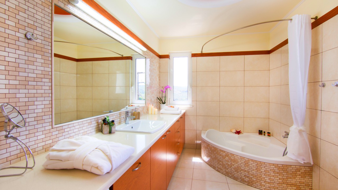 A big and comfortable bath with mosaic and tiles covering the walls and the bathtub. The large corner, semicircular shower with seat, can provide you with a shower or a very enjoyable bath. The bench length of 2.5m with a sink, ensures endless comfort for the placement of your personal hygiene and products. Also you will find a huge mirror with lighting available, a modern washing machine and many closets to provide you utilitarian amenities. A circular dome and the backlight adds to the room a particular elegance.